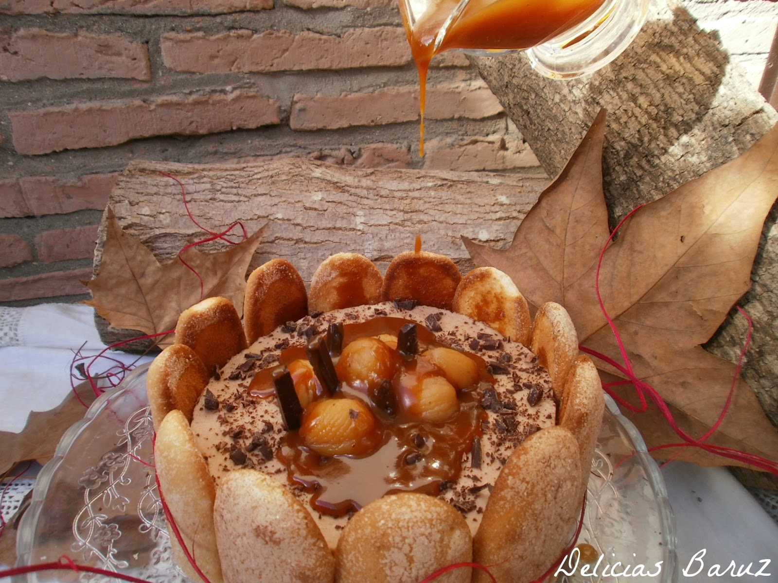 La charlota la he preparado con una crema chiboust a la que he añadido crema de castañas. La crema chiboust es una crema pastelera ligeramente gelificada a la que se añade un merengue italiano en caliente.